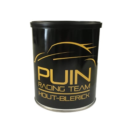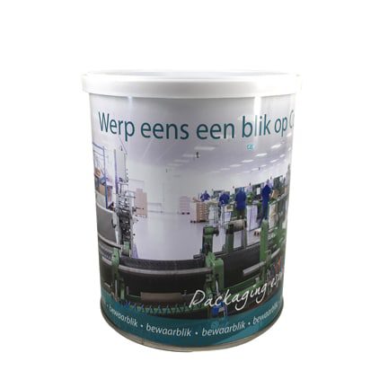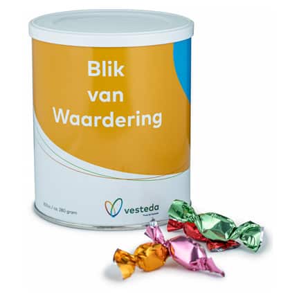 Gepersonaliseerd door middel van een full colour bedrukte wikkel om het snoepblik met uw bedrijfsnaam, logo of reclametekst, geheel naar eigen ontwerp.