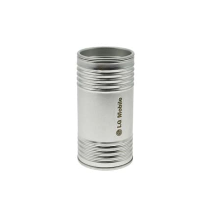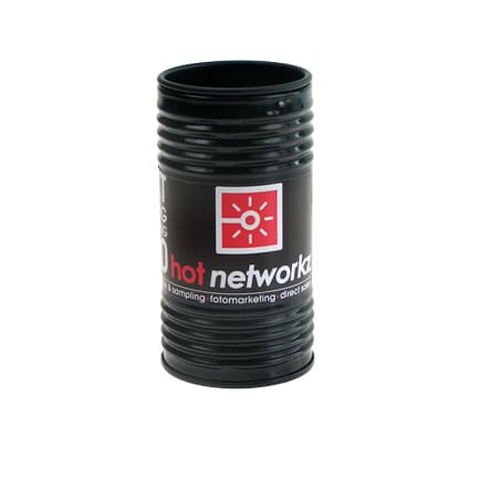 Bedrukking: full colour label om de romp van het blikje, tussen de ribbels.