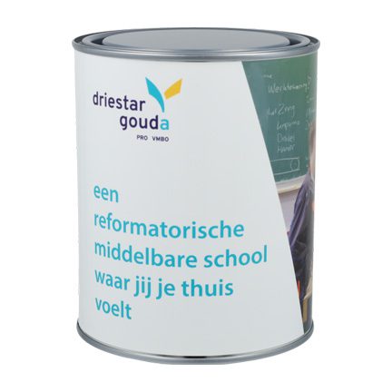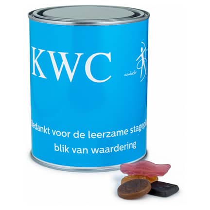 Verfblik met eigen logowikkel en hersluitbaar deksel voor een verse inhoud, keuze uit diverse zoetigheden. Gepersonaliseerd via een full colour wikkel met uw bedrijfsnaam, logo of slogan, dat zal gewaardeerd worden door uw klanten, medewerkers of relaties 🙂