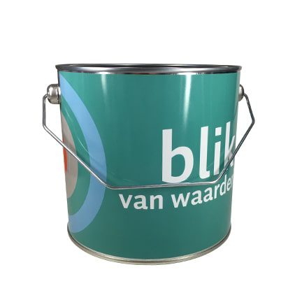Groot verfblik met hersluitbaar deksel en hengsel, dit is met recht een Snoepblik van formaat met een inhoud van maar liefst 2½ liter! Bedrukt met een full colour wikkel naar eigen ontwerp met uw bedrijfsnaam, logo of reclametekst is dit een reuze relatiegeschenk!