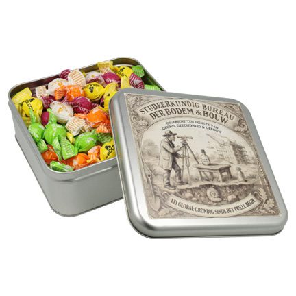Gepersonaliseerd vierkant Snoepblik met een rechtstreeks bedrukte oversluitdeksel. De deksel wordt full colour bedrukt met uw logo in eigen huisstijl, de uitstraling is prachtig. Een gravure op de deksel is ook mogelijk.