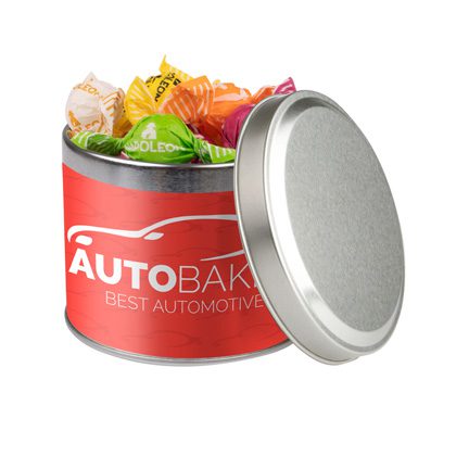 Zilverkleurig Snoepblik met eigen logowikkel. Gepersonaliseerd met uw logo naar eigen full colour ontwerp.