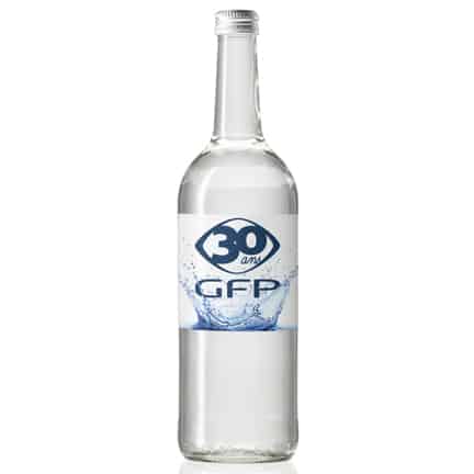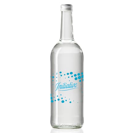 Gepersonaliseerde grote glazen Waterfles met zilverkleurige schroefdop als dorstlessend promotiemiddel. Het Waterflesje met mineraalwater wordt naar wens rondom full colour bedrukt met uw bedrijfslogo en reclametekst.