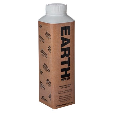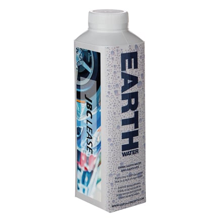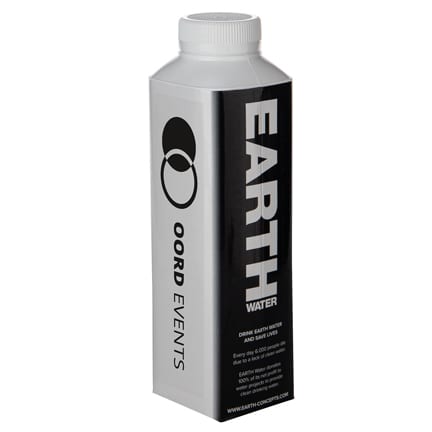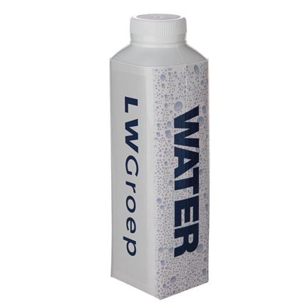 Kartonnen waterflesje met eigen label op 1 zijde van het vierkante flesje.