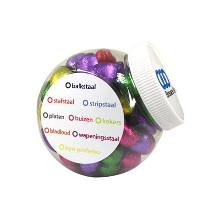 Verras uw klanten voor de Pasen met een smaakvol relatiegeschenk, een glazen snoeppot gevuld met zalige paaseitjes. De snoeppot is af te sluiten met een witte kunststof deksel. Deze snoeppot kan geleverd worden met full colour bedrukte vinyl stickers op de platte zijkanten. Uw Paasgeschenk wordt naar wens gepersonaliseerd met bijvoorbeeld uw logo, bedrijfsnaam of Paaswens, laat uw creativiteit de vrije loop!