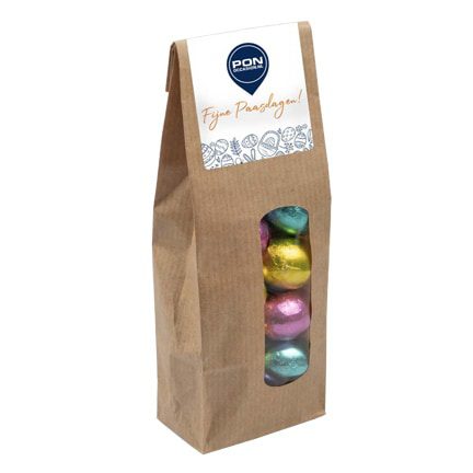 Stoer kraft Snoepzakje met gepersonaliseerde sticker gevuld met zalige chocolade Paaseitjes als smaakvol weggevertje voor Pasen.