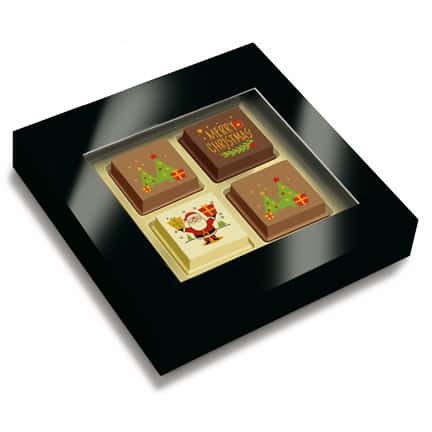 Bedrukking: standaard Kerst bedrukking eventueel in combinatie met 1 of 2 witte bonbons met full colour logo.