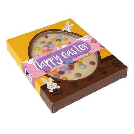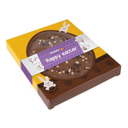 Paasei chocoladekaart per brievenbuspost versturen voor Pasen! Gepersonaliseerd met een full colour bedrukte logosleeve naar eigen ontwerp om het standaard doosje met venster.