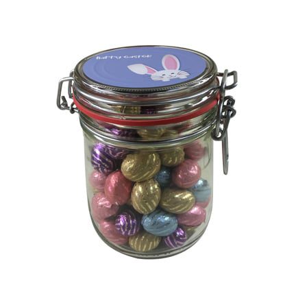 Glazen ronde weckpot gevuld met zalige paaseitjes, bedrukt met uw logo en Paaswens. De glazen deksel is hersluitbaar met een spansluiting, zo blijft de inhoud lekker vers.