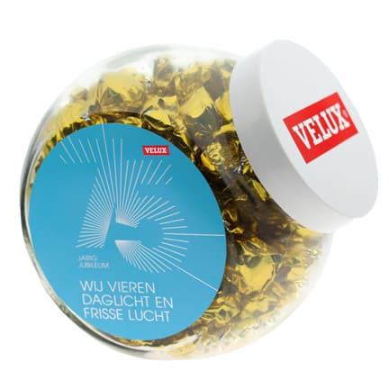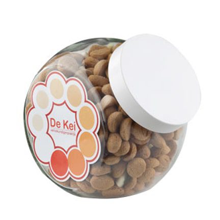 Grote schuinstaande glazen Snoeppot van 2 liter met hersluitbare witte schroefdeksel en gevuld met Kruidnoten, Sintschuim of Strooigoed als Eindejaarsgeschenk of bedankje voor klanten met Sinterklaas. De deksel is van kunststof en leverbaar in wit, zwart of zilver. De snoeppot kan worden voorzien van full colour bedrukte stickers met uw logo, bedrijfsnaam of tekst op de zijkanten. Optioneel is een sticker op de deksel.