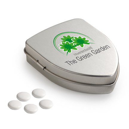 Hersluitbaar schildvorm blikje gevuld met ca. 26 gram pepermuntjes. Bedrukt met uw bedrijfslogo is dit een frisse give-away. Het blikje is leverbaar in de kleuren wit en zilver en wordt geleverd incl. ingrediëntensticker en seal. Daarbij is dit artikel lang houdbaar, wel 36 maanden, dus handig om op voorraad te nemen.