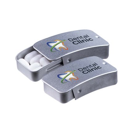 Zilverkleurig schuifblikje met ca. 7 gram Tic Tac met mint- of sinaasappelsmaak incl. ingrediëntensticker en seal. Gepersonaliseerd met uw bedrijfslogo is dit frisse weggevertje zeer geschikt tijdens een beurs, bijeenkomst of evenement.