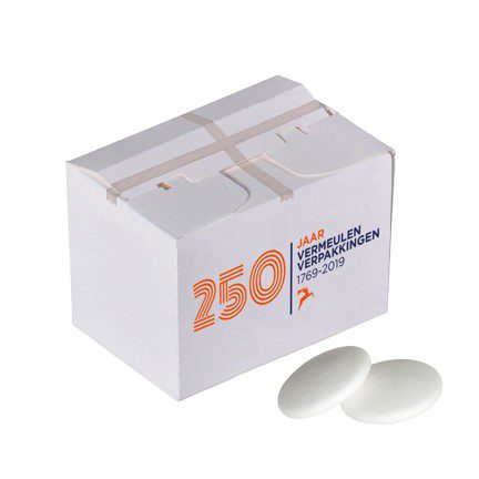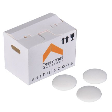 Als makelaar of verhuisbedrijf op zoek naar een toepasselijke give-away? Wat denkt u van gepersonaliseerde verhuisdoosjes gevuld met ca. 26 gram imperiale pepermunt, dat is wel heel toepasselijk bij de verkoop van een huis of een verhuizing! Bedrukt met uw bedrijfsgegevens is dit een fris en persoonlijk weggevertje, die ook nog eens lang houdbaar is.