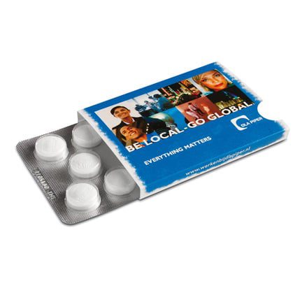 Geef een complimentje weg aan uw zakenrelaties en klanten. Kies voor een gepersonaliseerde sleeve met daarin een pepermuntblister met 10 Complimints. All-over full colour bedrukt met uw bedrijfsontwerp, logo of tekst is dit een positief & lekker fris weggevertje. Dit artikel is lang houdbaar, dus ideaal om op voorraad te nemen, zo kunt u altijd een complimentje uitdelen!