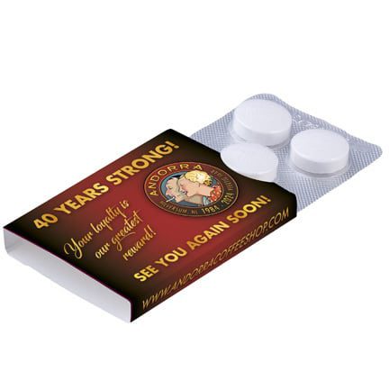 Geef een complimentje weg aan uw zakenrelaties en klanten. Kies voor een gepersonaliseerde sleeve met daarin 5 Complimints in een blister. All-over full colour bedrukt met uw bedrijfsontwerp, logo of tekst is dit een positief weggevertje. Dit artikel is lang houdbaar, dus ideaal om op voorraad te nemen, zo kunt u altijd een complimentje uitdelen 🙂