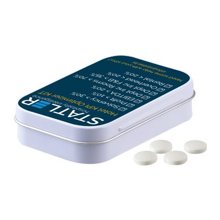 Een gepersonaliseerd gevuld pepermuntblik van formaat weggeven? Kies voor een groot scharnierblik gevuld met pepermunt. Bedrukt met uw bedrijfsontwerp en logo is het eindresultaat echt een blik om te bewaren. Zo blijft uw bedrijf lang in beeld!