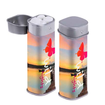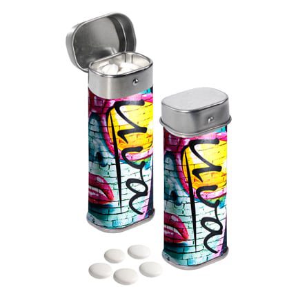 Hersluitbaar zilverkleurig hoog Pepermuntblikje met all-over full colour label gevuld met pepermuntjes, de ingrediënten worden meegedrukt, incl. seal. Gepersonaliseerd met uw bedrijfsontwerp en logo is dit een blikje om te bewaren!