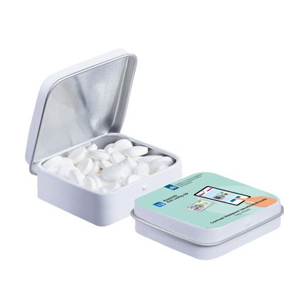 Vierkant Pepermuntblikje gevuld met ca. 23 gram frisse pepermunt incl. ingrediëntensticker en seal. Gepersonaliseerd met uw bedrijfslogo in 1 of meerdere kleuren, is dit een lekker fris promotiemiddel 🙂