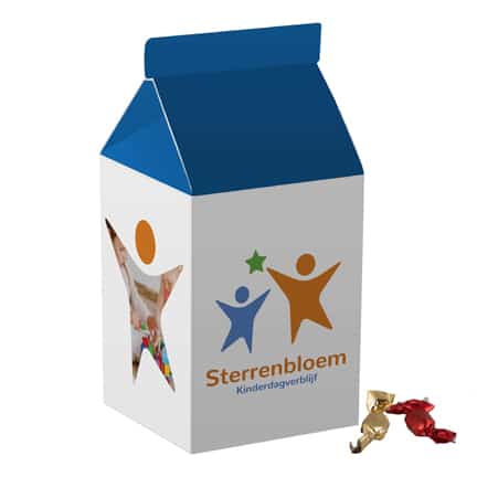 Gepersonaliseerd Snoepdoosje in de vorm van een melkpakje, gevuld met per stuk verpakte zuurtjes. Het Snoepdoosje wordt bedrukt naar eigen ontwerp, met uw logo & promotietekst. Het eindresultaat zal een origineel promotiemiddel zijn 🙂