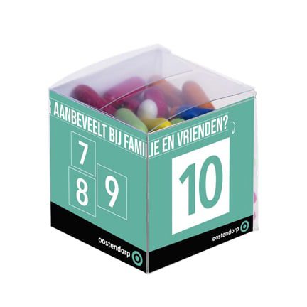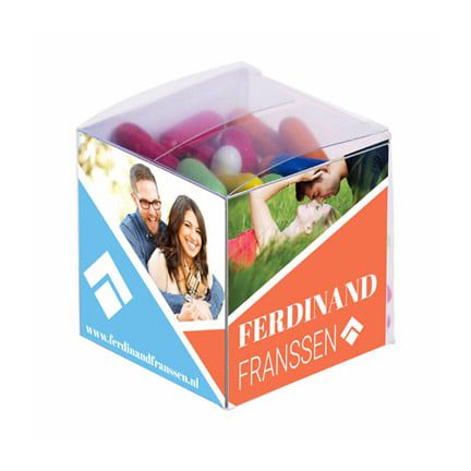 Transparante kubus gevuld met vrolijk gekleurde dropstaafjes, gepersonaliseerd door middel van een full colour bedrukte inlay. De kubus kunt u rondom bedrukken met uw reclametekst en bedrijfslogo. Zo heeft u aardig wat ruimte om uw boodschap over te brengen bij uw klanten.