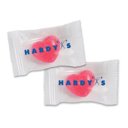 Hartvormige snoepjes in een gepersonaliseerde flowpack. All-over bedrukt met uw bedrijfslogo of -naam in 1 of meerdere kleuren. Dit weggevertje is ook goed te gebruiken als vulling van uw bedrukte snoeppot of snoepblik, dat is dubbele naamsbekendheid!