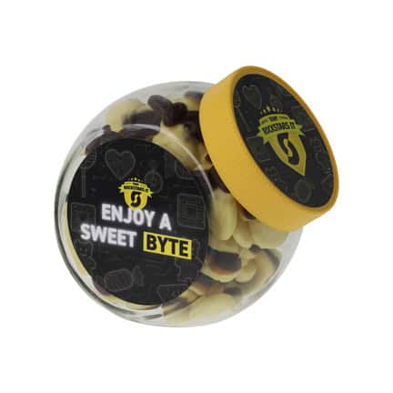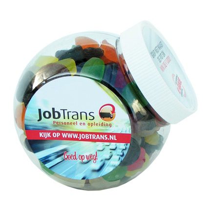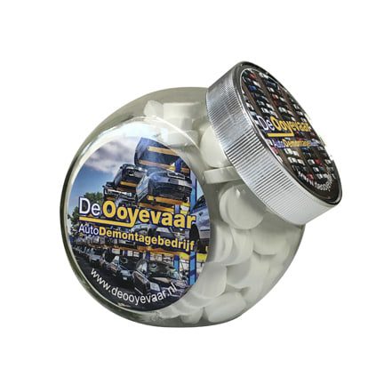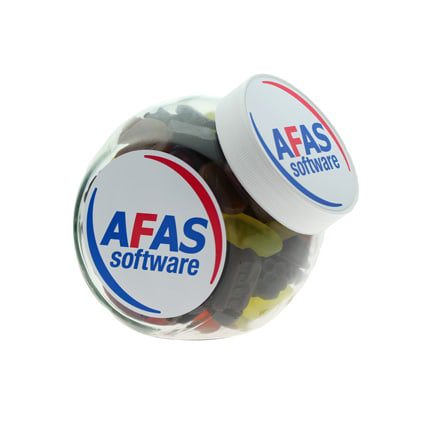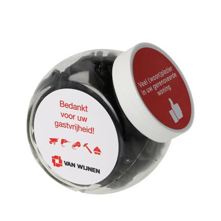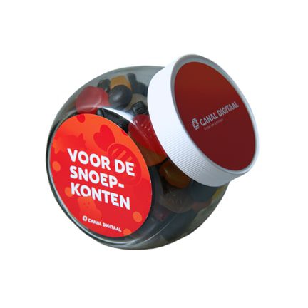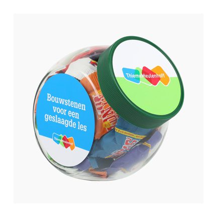 Bedrukking: full colour sticker op de zijkanten en/of deksel van de snoeppot.