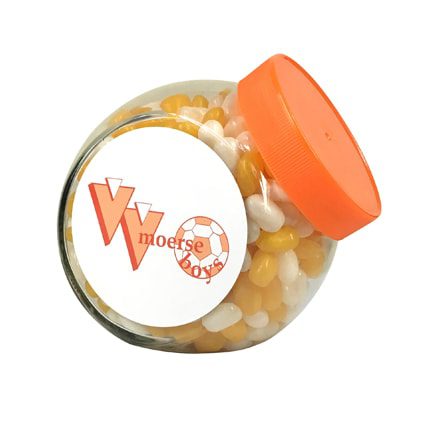 Verras uw klanten met een smaakvol relatiegeschenk, een glazen Snoeppot gevuld met inhoud naar keuze. De snoeppot is af te sluiten met een gekleurde kunststof schroefdeksel, kies een kleur deksel uit die bij uw bedrukking past. De snoeppot wordt gepersonaliseerd naar wens met full colour bedrukte vinyl stickers op de zijkanten en/of deksel. Qua bedrukking kunt u denken aan uw logo, bedrijfsnaam of promotietekst, laat uw creativiteit de vrije loop en promoot uw logo op een smaakvolle manier!