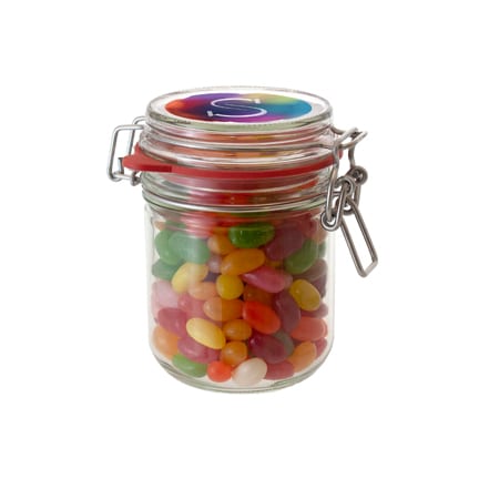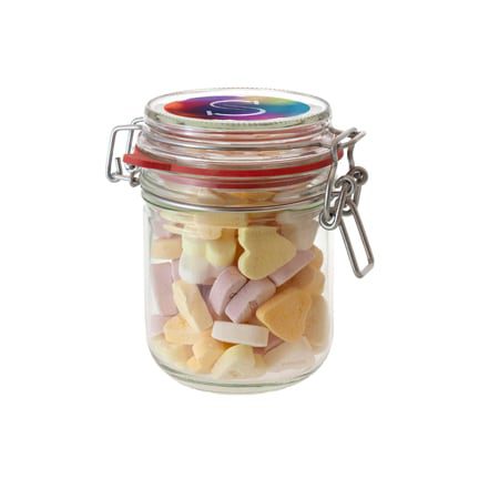 Glazen weckpotje met logo als smaakvol promotiemiddel. Bedrukt met uw logo middels een full colour sticker op de deksel.