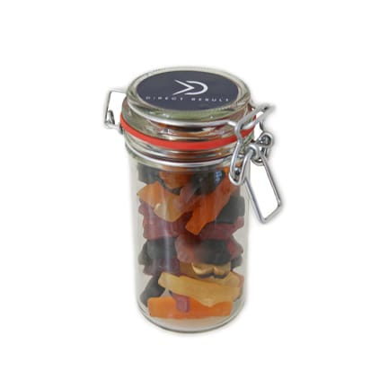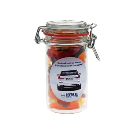Snoep vers houden in een glazen weckpot? Bestel bij Sweetgifts een gevuld Snoeppotje met spansluiting incl. rode rubberen ring, de vulling is naar keuze. Er kan een full colour bedrukte vinyl sticker geplaatst worden op de zijkant. Tegen meerprijs is ook een sticker op de deksel mogelijk. Leuk als relatiegeschenk of bedankje voor uw klanten 🙂
