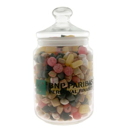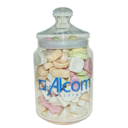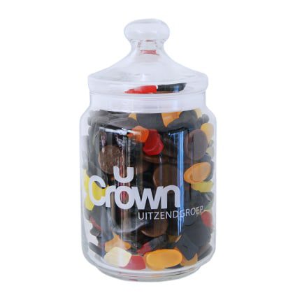 Deze snoeppot is prachtig met rechtstreekse bedrukking! Deze snoeppot zal nog lang bewaard blijven door uw klanten.