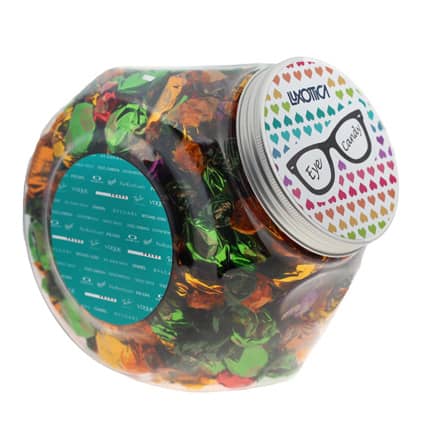 Grote schuinstaande Snoeppot met aluminium schroefdeksel, gevuld met vrolijke inhoud doet deze reus het goed op de balie bij de receptie! Gepersonaliseerd met uw bedrijfsnaam, logo of slogan is deze snoeppot van formaat een echte blikvanger. Deze snoeppot is van kunststof en kan tegen een stootje 🙂
