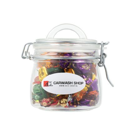 De Snoeppot wordt gepersonaliseerd met een ovale sticker op de zijkant van de pot, zodat deze goed zichtbaar is. Ontwerp naar eigen keuze, alleen je logo of een full colour all-over design naar eigen wens.