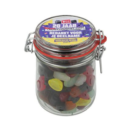 Ronde glazen Snoeppot gevuld met snoep naar keuze, bedrukt met uw bedrijfsnaam, logo of eigen ontwerp. Daar kunt u mee binnenkomen bij uw klanten. De weckpot is hersluitbaar met een deksel met spansluiting, zo blijft de inhoud lekker vers.