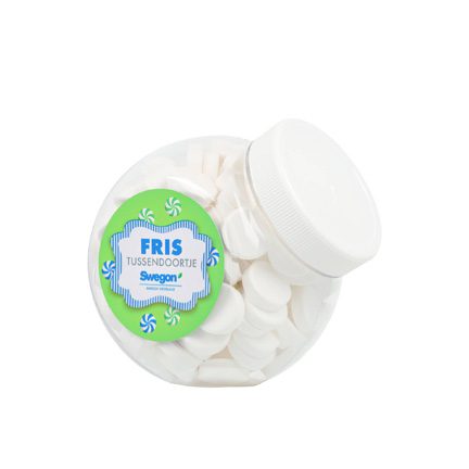 Schuinstaand kunststof snoeppotje met witte deksel, gepersonaliseerd met uw bedrijfsnaam, logo of reclametekst in full colour bedrukking op de zijkanten van de snoeppot. Daar kunt u mee voor de dag komen bij uw klanten en zakenrelaties. Zo blijft uw bedrijfsnaam smaakvol in beeld 🙂